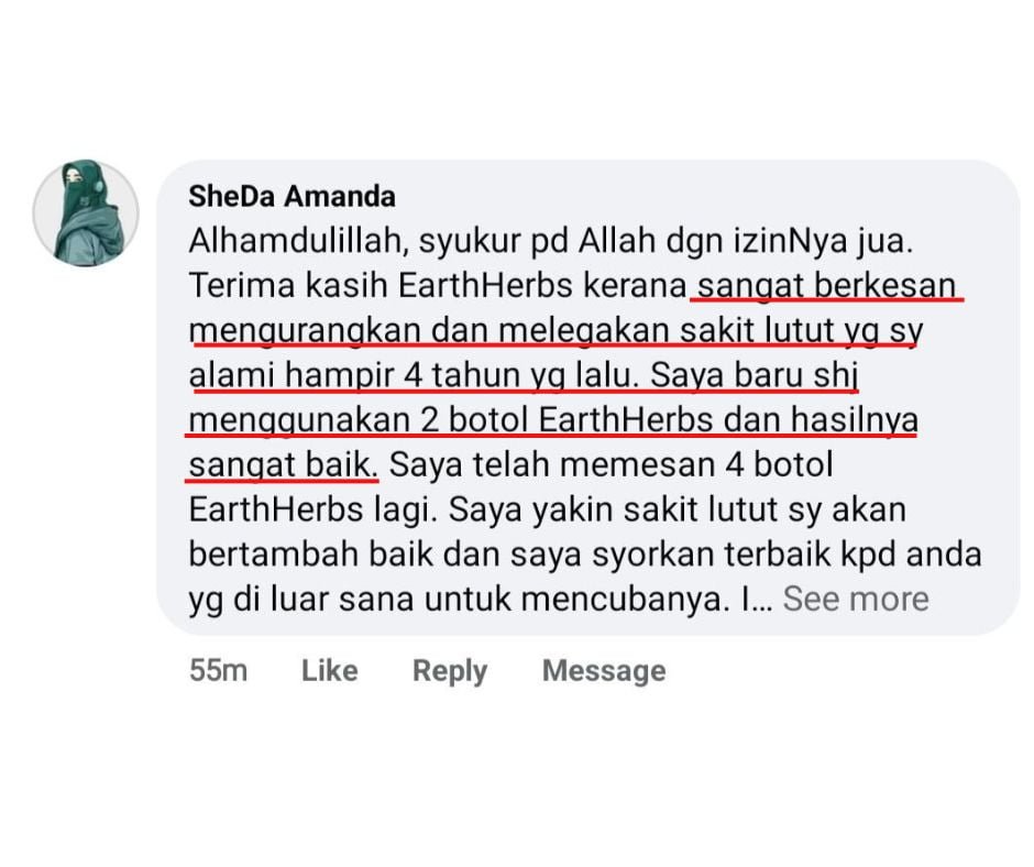 “Alhamdulillah sakit lutut dan semakin kurang selepas 5 hari amalkan Gel EARTHHERBS ni..”